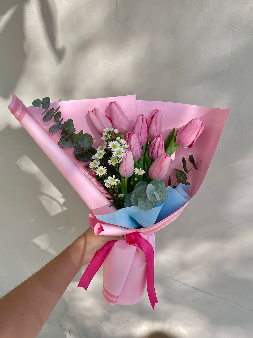 Tulipanes rosita en papel celeste
